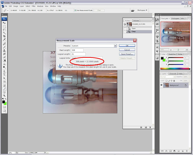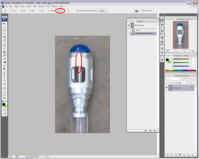 The following picture was posted to apparently disprove the above finding. I have performed analysis to show how erroneous this is. The picture has been scaled to 6.75mm, which is the length from lower edge of crenallation to the bottom narrow diameter of the ball on the original Eccleston prop. Bear in mind there is a slight perspective distortion in the pic below due to the sonic being angled towards up which will skew the prop measurement slightly towards the shorter end of the scale by about 0.5mm but is enough to demonstrate my point.