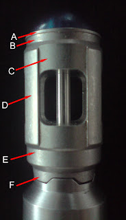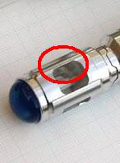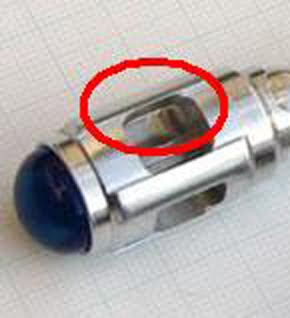 Where the pencil is pointing is a distinct black area indicating a gap in between the ball and the crenellated wall where the ball is full screwed into the emitter head. This gap is very noticeable and you can fit your thumbnail into it easily on the prop. On the MFX the joint is flush.