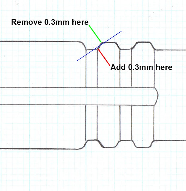 The blue line is the plane where the correction needs to be made. Above the line material needs to be removed, below the line material needs to added. Paint can add that 0.3mm or so into the trough of the ridge where it will pool (and that will account for why the MFX ridge trough is deeper than the prop) but it cannot take away the 0.3mm material that ruins the ridge shape.