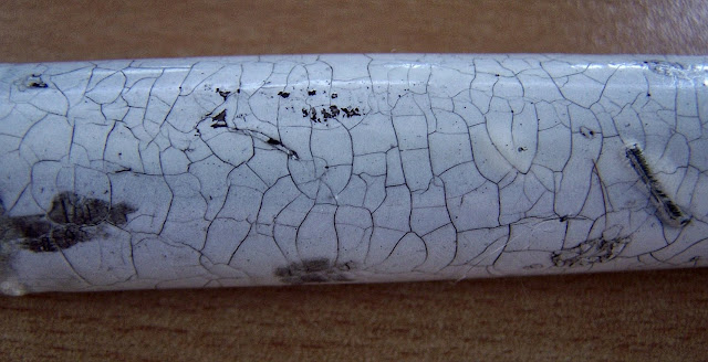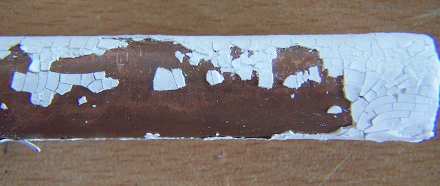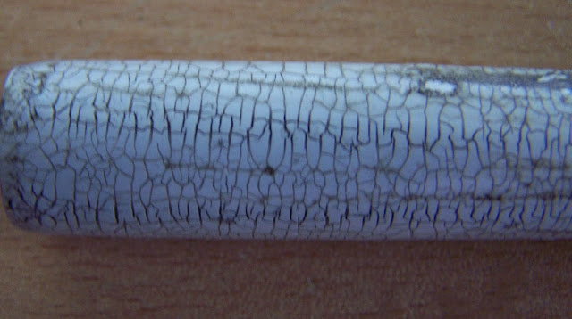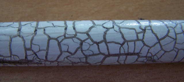 As for the color of paint used, there are three candidates: Picket Fence (white), Antique Linen (a creamy 'greige') or Rock Candy. As 'Rock Candy', which is a clear crackle similar to Giclee varnish, was not available until last year I suspect it was one or both of the former. QMx,  I am almost certain, used the clear variety 'Rock Candy' over a white basecoat using a similar technique that I am about to reveal. (Indeed, you can try it yourself using the Tim Holtz Rock Candy as it is not bad: more durable than the pigmented versions and certainly more forgiving to apply but nowhere near as good as the stuff I am about to show you).
